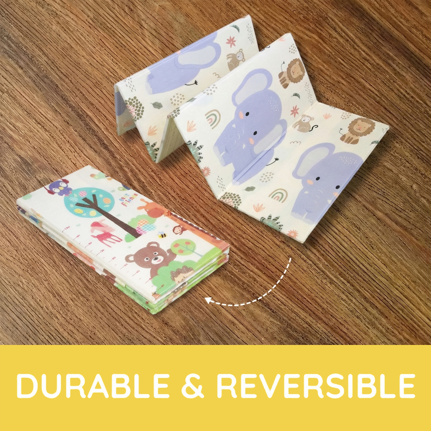 - Side A: Animal theme with built-in height chart to track baby growth.
