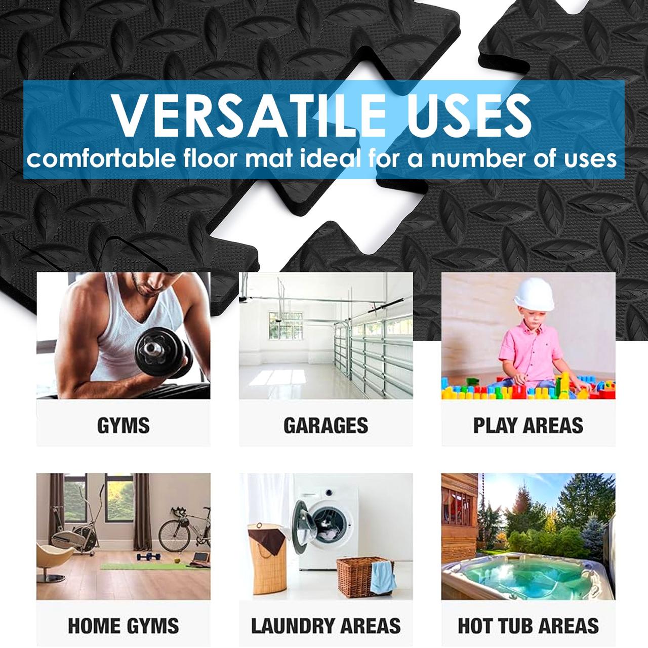 Versatile interlocking tiles suitable for gym floors, garage mats, swimming pool areas, and foam play zones.